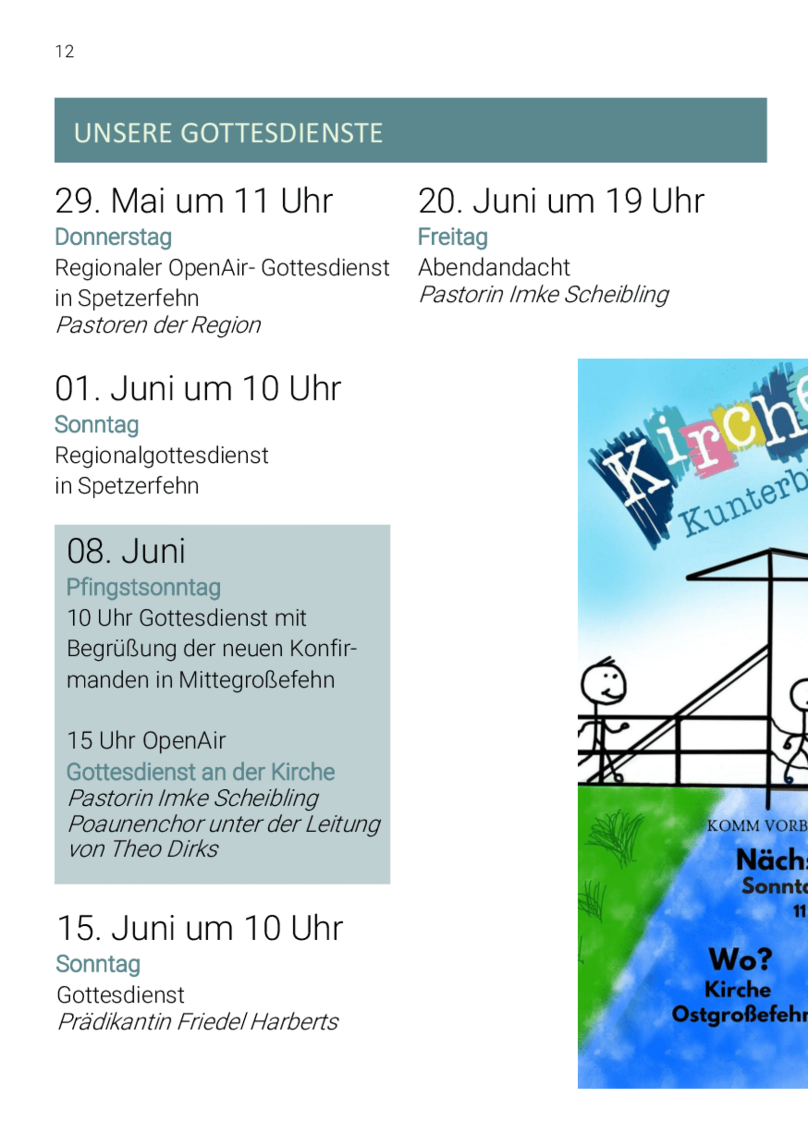 findet jeden Sonntag um 10 Uhr in der Ev.-luth. Auferstehungskirche Ostgroßefehn, Kanalstraße Süd 161, 26629 Großefehn statt, es sei denn es gibt einen Abend-, Regional- oder Ortsteilgottesdienst. Wer einen Mitschnitt des Gottesdienstes wünscht oder nicht dabei sein kann, wende sich doch bitte an unsere Pastorin, einen Kirchenvorsteher oder unsere Küsterin. Die Predigten werden auch digital noch einmal auf unserer Homepage zu hören sein unter Sonntagsandacht. Wer nicht selbstsändig zum Gottesdienst erscheinen kann und einen Fahrdienst benötigt, wende sich ebenfalls an den Kirchenvorstand.